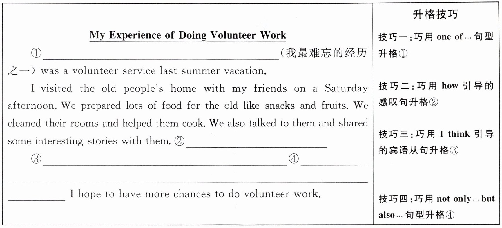 ①One of my most unforgettable experiences; ②How happy they were!; ③I think this kind of activity is meaningful. ; ④We can not only bring warmth to the old people,but also learn to love and share in this way.