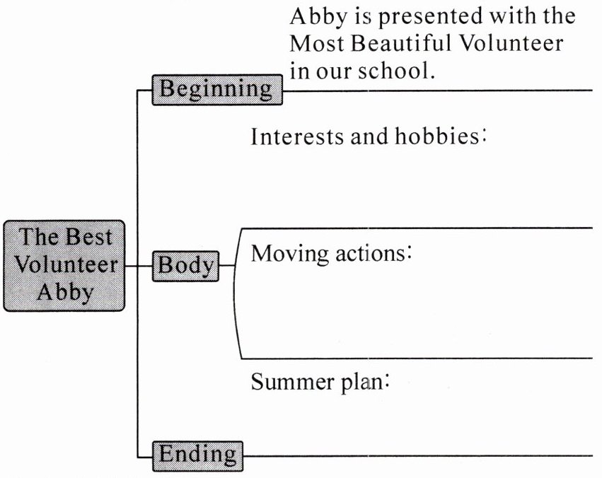 (2023−2024.六安市金寨县期末)假如你是学校的一名小记者,你对学校评选的“最美志愿者”Abby进行了一次采访。请你根据以下采访记录写一篇英语稿件,向读者介绍她的情况。