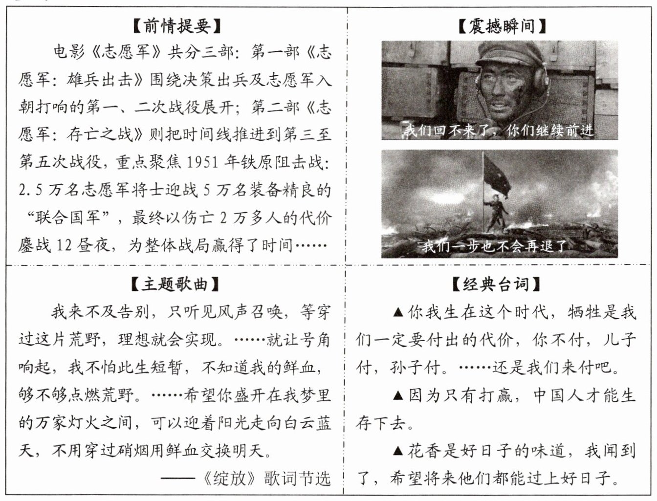 (3) 联系“震撼瞬间”和“经典台词”,为电影《志愿军:存亡之战》写一则影评。(4分)