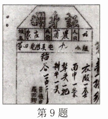 9. 右图是一张土地改革时期颁发的“翻身证”,该证取名为“翻身证”是基于当时我国……( )