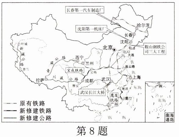 8. 如图反映了我国第一个五年计划期间工业和交通建设的主要成就,其中川藏、青藏、新藏公路开通的突出作用是……( )