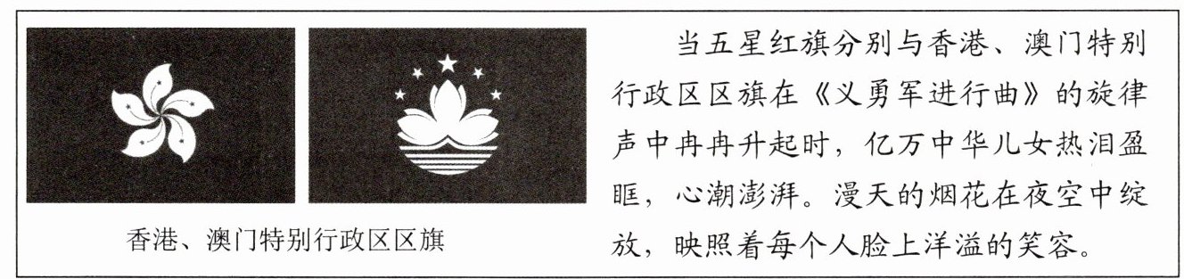 (2) 1997年7月1日;1999年12月20日。(2分)两面旗帜升起,香港、澳门回归祖国,标志着中国人民洗雪了百年国耻,在完成祖国统一大业的道路上迈出了重要一步。(2分)
