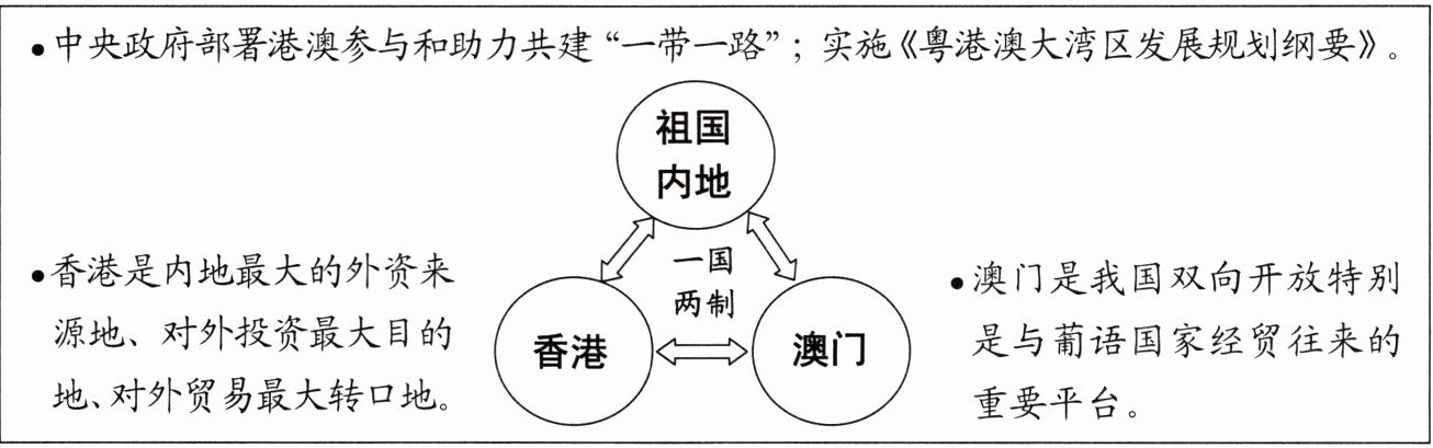 (3) 局面:香港、澳门呈现与内地优势互补、合作共赢、共同发展的良好局面。(2分)原因:中央政府全面准确推进“一国两制”实践,深化内地和港澳地区交流合作等。(2分)