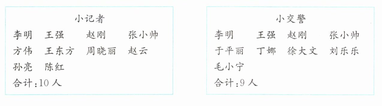 4.拓展探究:如果两项活动都参加的有5人,参加社会实践活动的一共有几人?如果两项活动都参加的有6人、7人、8人或9人呢?