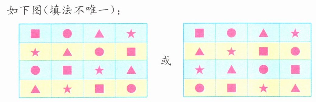 分析 (1)要使横行、竖行和对角线上的每4个图形都不重复,我们可以先填两条对角线上的图形,根据已知的第一行的图形进行排除,进而得出其他方格中可以填的图形。