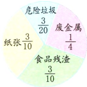 (3)答案不唯一,如纸张和废金属一共占垃圾总量的几分之几? $\frac{3}{10} + \frac{1}{4} = \frac{11}{20}$