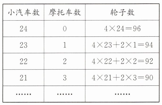 继续试下去,我们可以发现,每减少一辆小汽车,增加一辆摩托车,就减少2个轮子。当小汽车19辆,摩托车5辆时,轮子数是86。