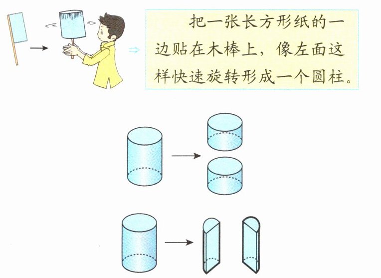 (1)蜡烛、木墩等的形状都是圆柱。沿长方形的一条边旋转一周,形成圆柱。