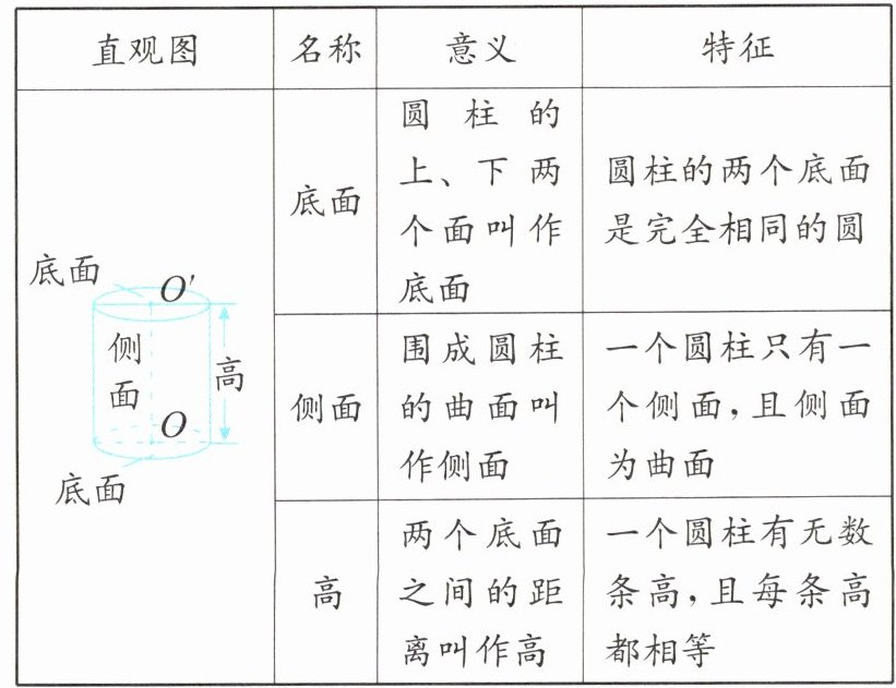 1.圆柱的上、下两个面叫作底面,围成圆柱的曲面叫作侧面。