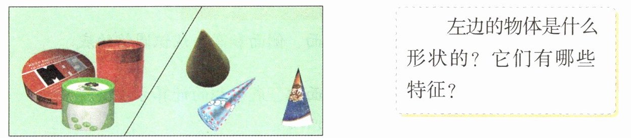 图中左边的每个物体从上到下都一样粗,并且每个物体的上、下两个面都是完全相同的圆形。像这样形状的物体都是圆柱形的,简称圆柱。