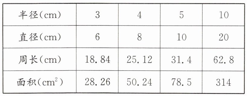 (3)从表中可以找出成正比例关系的量,只要两种量的比值不变就成正比例关系,比如,直径与半径的比值永远是2,它们就是成正比例关系的量。