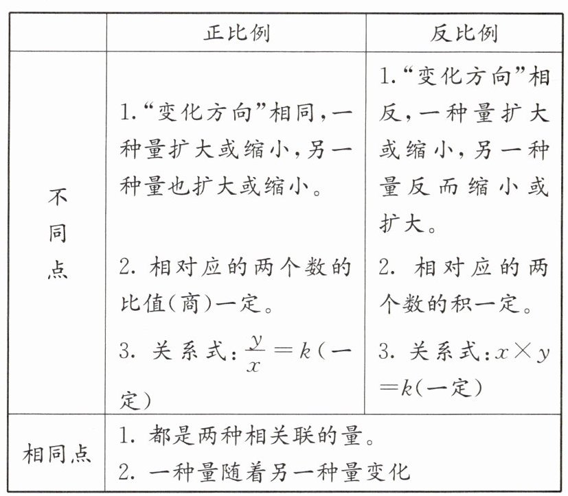 7. 拓展探究:正比例与反比例的异同点如下表。