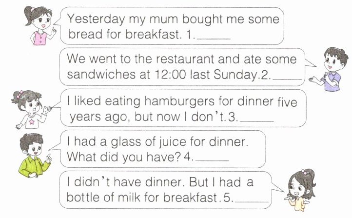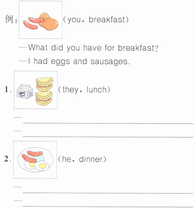 —What did they have for lunch?@@—They had milk and sandwiches.@@—What did he have for dinner?@@—He had eggs and sausages.