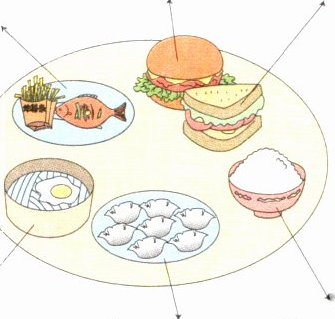 fish and chips@@hamburger@@sandwich@@noodles@@dumplings@@rice@@4 5 6@@1 2 3