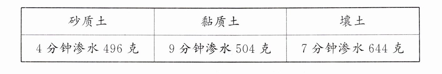 4.学科融合陶器是人类最早用火烧制的容器,保水能力强的土壤才适合做陶器。将等量的水同时倒入3个装有不同土壤的漏斗中,根据下表计算,什么土壤最适合做陶器?(主要对应目标:3205)