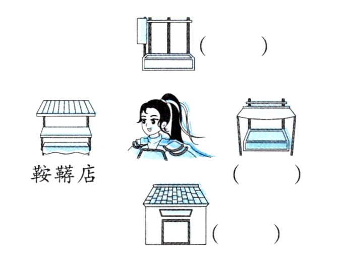 《木兰辞》叙述了花木兰替父从军的故事,“东市买骏马,西市买鞍鞯(ān jiān),南市买辔(pèi)头,北市买长鞭。”是描述木兰在代替父亲上战场之前,去集市给自己买装备的过程。你能在右图中找到这些店铺吗?(填序号)(鞍鞯:马鞍和马鞍下面的垫子;辔头:驾驭牲口的嚼子和缰绳)