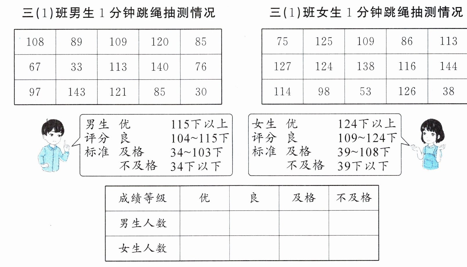 2.下面是育才小学三(1)班1分钟跳绳抽测情况,请你先将统计结果制成一张复式统计表,再回答问题。(单位:下)