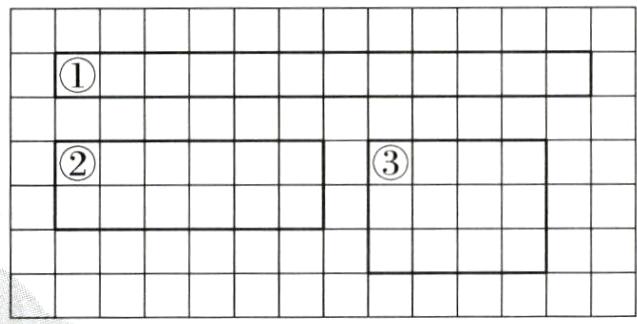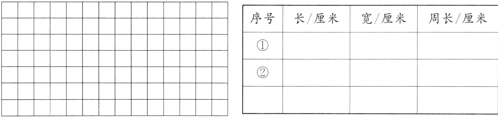 4. (浙江杭州)下面每个小正方形代表1平方厘米。在方格纸上,画出面积是12平方厘米的全部长方形,并标上序号,如①和②,算出它们的周长,填入表格中。(主要对应目标:3505)