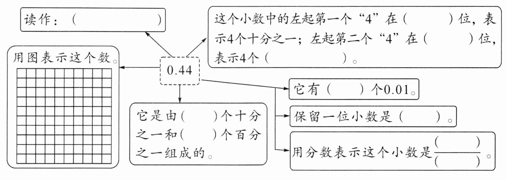 (1)新题型 梵蒂冈是世界上国土面积最小的国家,面积是0.44km²。用多种方式表示“0.44”。