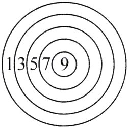 5.下图是一个靶,靶上的1,3,5,7,9表示射中该靶区的分数。小军说:“我打了6枪,每枪都中靶,总分是27分。”小伟说:“我打了5枪,每枪都中靶,总分是27分。”你知道他们两人中谁算错了总分吗?为什么?(主要对应目标:5205)