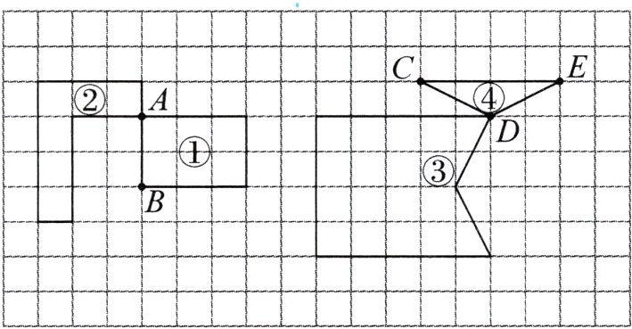 (3)得到图④:图①先向下平移( )格,再向( )平移( )格;图②先向( )平移( )格,再绕点O( )时针旋转( )°。