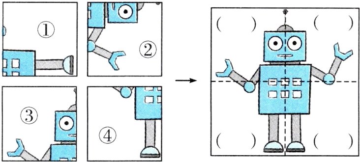 1. 左图是被打乱的四张图片,怎样才能还原成右图?(先在图中标序号,再填一填)(主要对应目标:5501、5503)