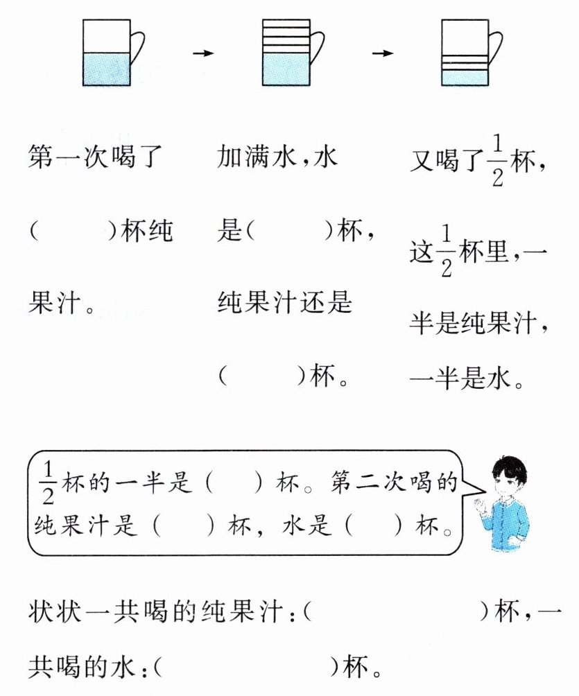 1. 一杯纯果汁,状状喝了半杯后,觉得太浓了,就兑满了水,他又喝了半杯,就出去踢足球了。状状一共喝了多少杯纯果汁?多少杯水?(主要对应目标:5607)