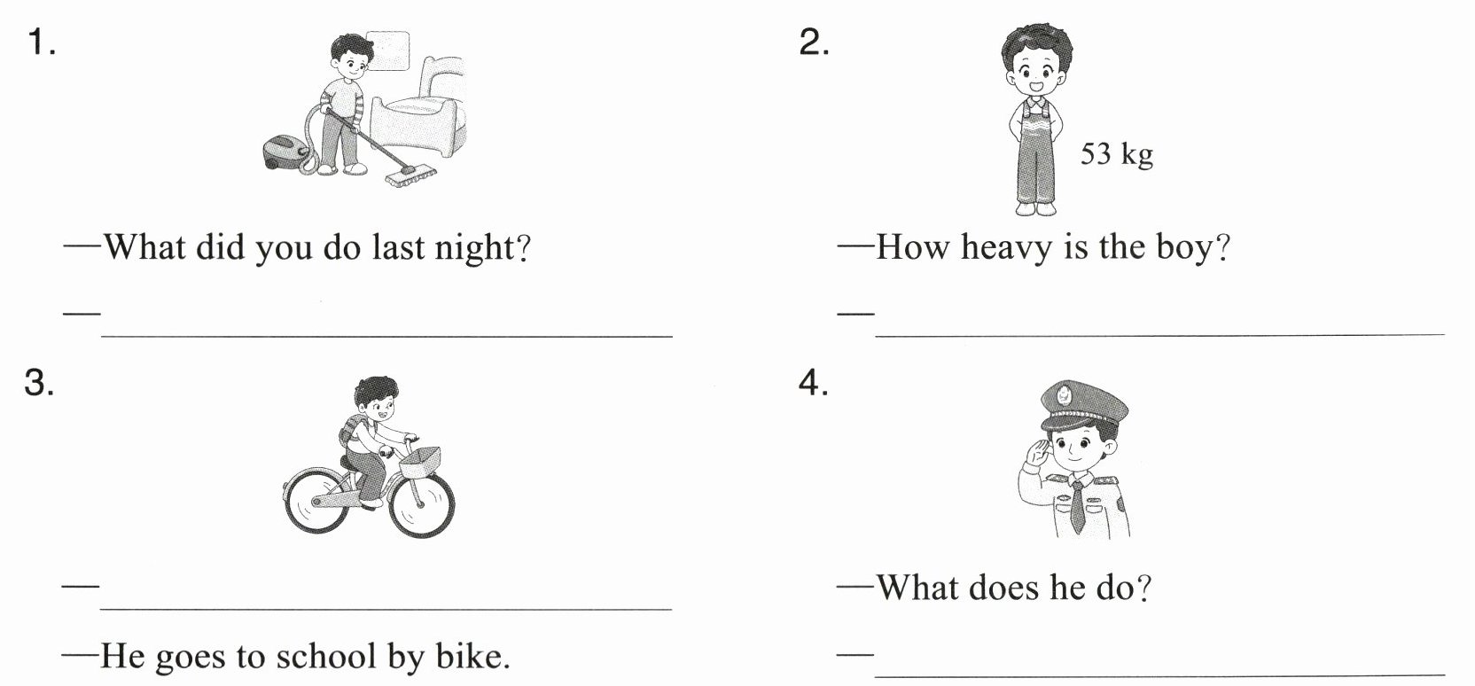 五、根据图片提示,写出相应的问句或答语。(10分)