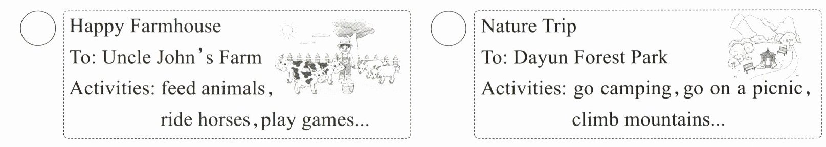 八、劳动节快到了,你和家人正在讨论出行计划。以下是可供选择的两种方案,请在你喜欢的方案前面画“√””,并根据方案写出具体的计划。(10分)