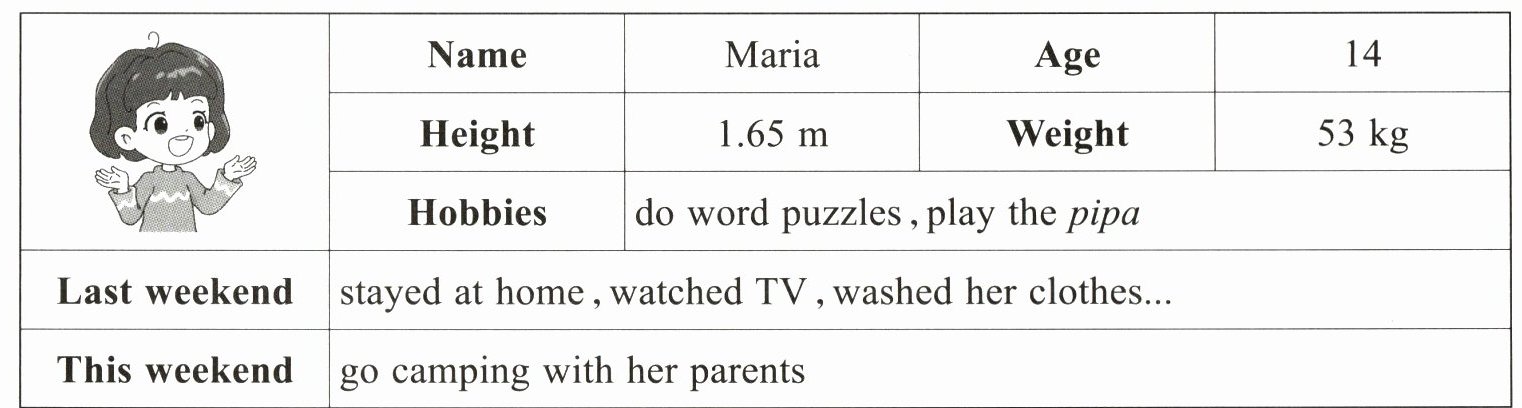 Maria is my good friend. She is 14 years old. She is 1.65 metres and 53 kilograms. She likes doing word puzzles and playing the pipa. Last weekend, she stayed at home. She watched TV and washed her clothes. She will go camping with her parents this weekend. She will have a happy weekend.