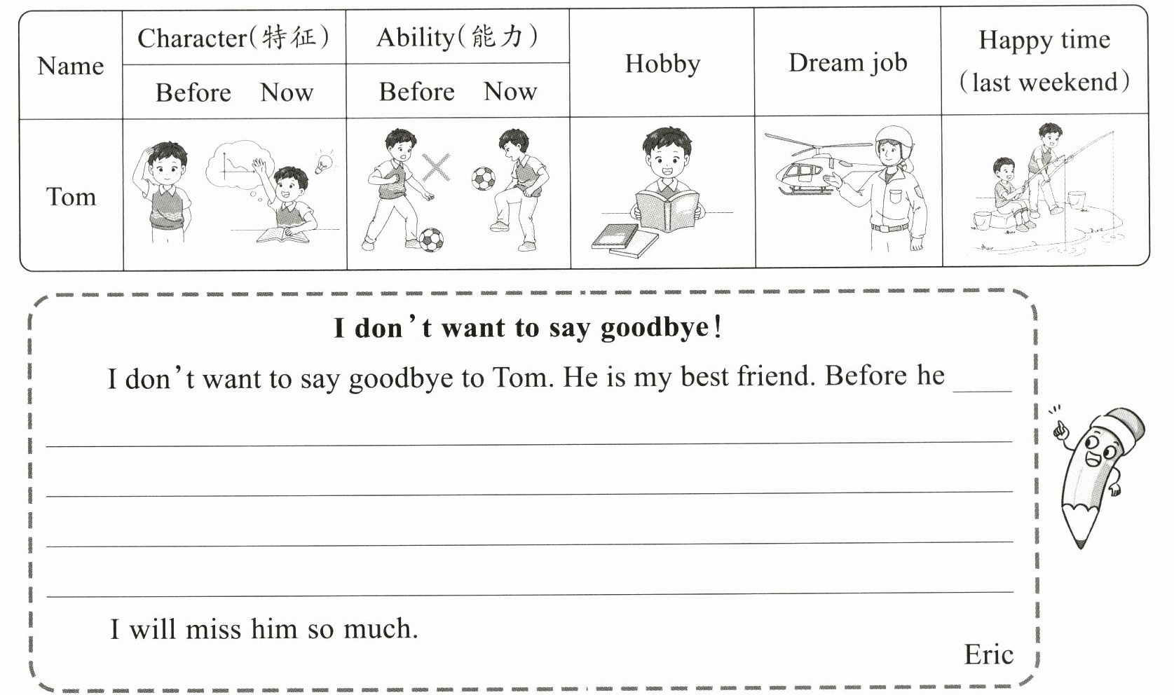 I don’t want to say goodbye to Tom. He is my best friend. Before he was shy. Now he is active in class. Before he couldn’t play football. Now he can play football well. His hobby is reading. He wants to be a pilot in the future. We went fishing last weekend. We had a good time.