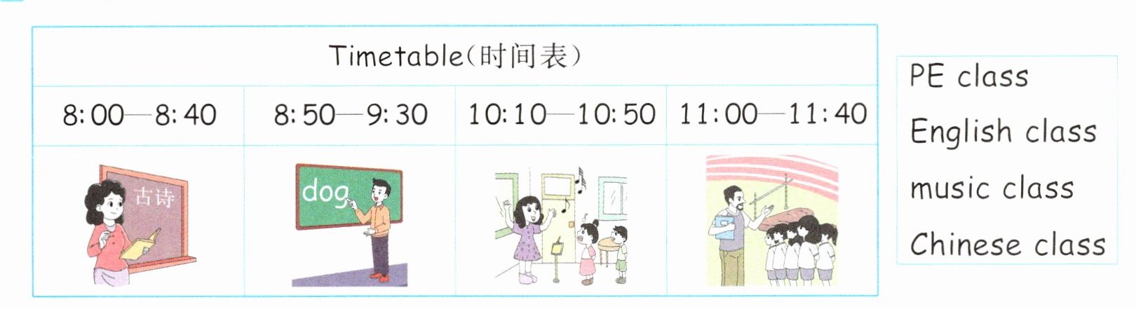 Hello, I am Chen Jie. We have four classes in the morning. It's 8:00. It's time for 1. ________. It's 8:50. It's time for 2. ________. It's 10:10. It's time for 3. ________. It's 11:00. It's time for 4. ________. We study hard and never be late.