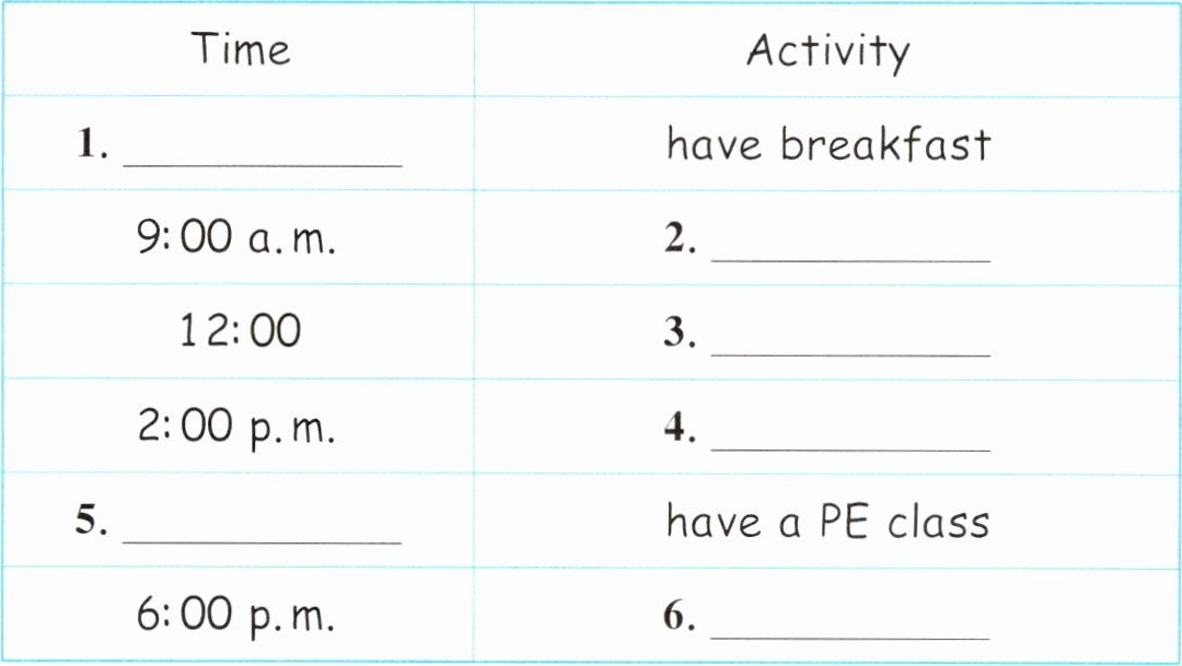 7:30 a.m.@@have a Chinese class@@have lunch@@have a music class@@4:00 p.m.@@have dinner