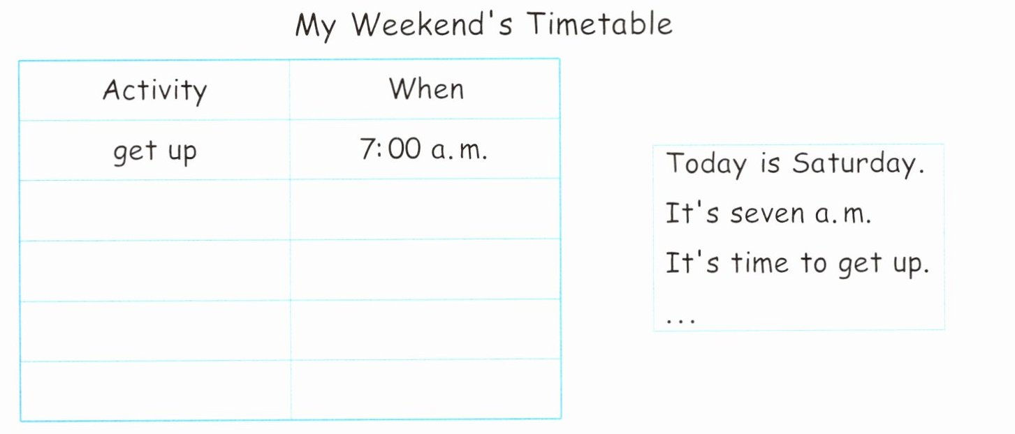 同学们,我们要想成为一位优秀的时间管理者就要学会制定合理的计划。周末你是怎么安排的呢?请完成下面的周末时间表并说一说吧。