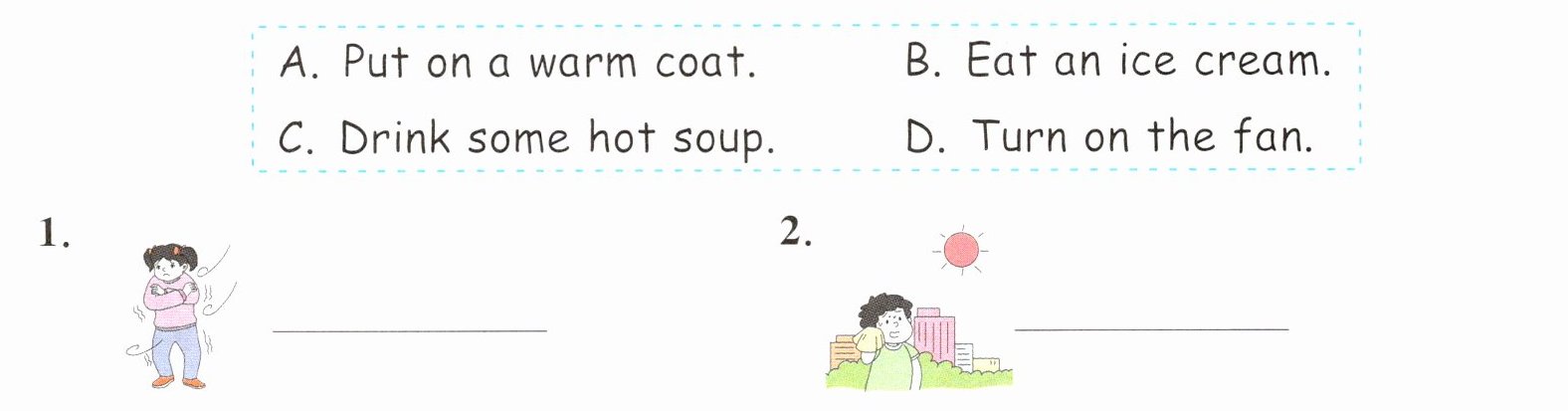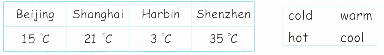 Good morning. This is the weather report. It's 1. ________ in Beijing. It's 2. ________ in Shanghai. It's 3. ________ in Harbin. So you'd better put on a coat. And it's 4. ________ in Shenzhen. You can swim in the sea.