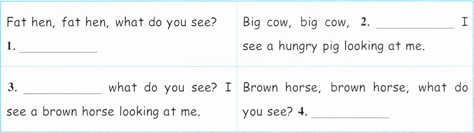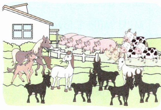 Wow! It's a big farm. Look at those1. ________. They are pink and fat. They are so cute. I see four 2.________. They are small. I see three 3. ________. They are black and white. They are so big. Can you see any 4. ________? They are eating grass. Oh, look! Are these sheep? No, no, no! They are 5. ________. One is white and the others are black.
