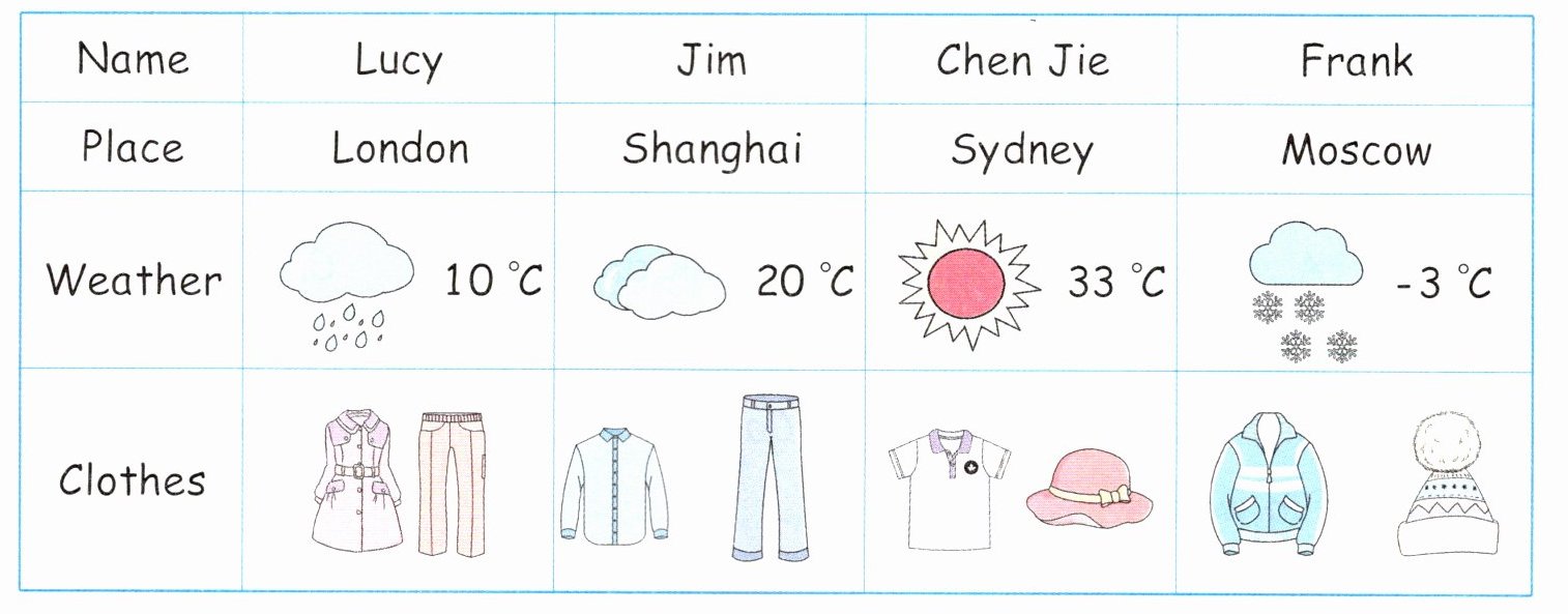 ( )2. It's sunny and hot in Sydney. Chen Jie has a T - shirt and a hat.
