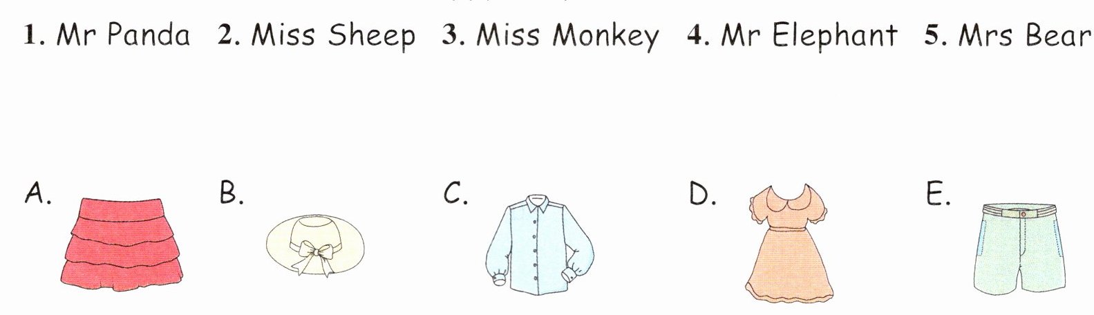There is a fashion show. The animals wear their nice clothes. Mr Panda wears his new shorts. Miss Sheep wears an orange dress. She looks very beautiful. Miss Monkey wears her skirt. It's red. Mr Elephant wears a blue shirt. What about Mrs Bear? She wears a yellow hat. And she looks like a star. How happy they are!