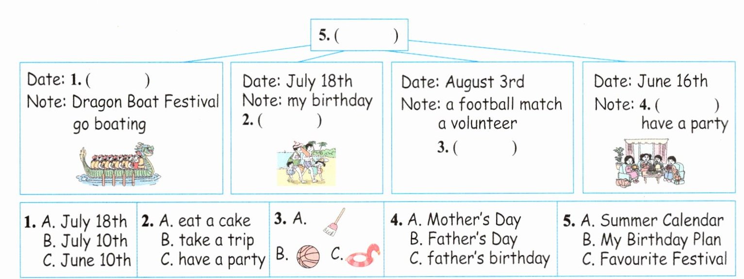 My favourite festival is Dragon Boat Festival. It is on June 10th this year. Look at this picture. I am boating. My birthday is on July 18th. It is in summer vacation. Mum says my family will take a trip to Sanya. I can swim in the sea. Great! On August 3rd, I will have a football match(比赛). I can't play football. I'm a volunteer. I'll clean the playground. Father's Day is on June 16th. Look! We are having a party. Dad is very happy.