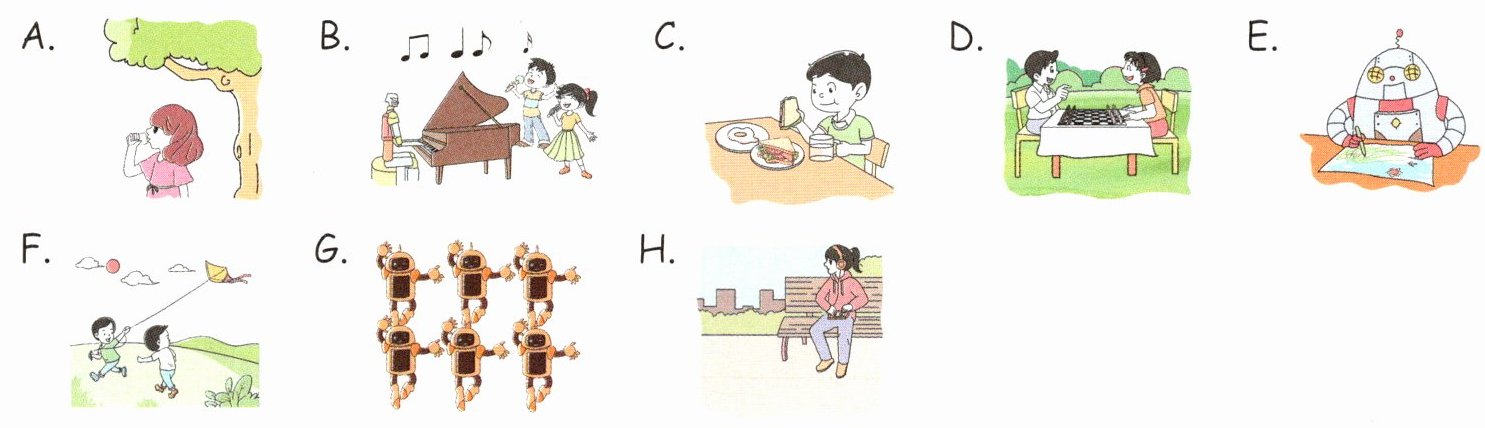 It's warm today. My friends and I go to the park.Look! I'm eating sandwiches.Nancy is listening to music.David and Lily are playing chess.Daming is so excited.He is flying a kite with Sam.Amy is drinking water under the tree.