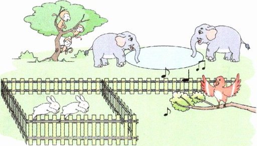 It's sunny today. I go to the zoo with my friends. The zoo is very big. There are many kinds of animals. We can see a bird, some rabbits, monkeys and elephants. Look! The rabbits are jumping. Listen! The bird is singing. Oh, those monkeys are climbing trees. They're so cute. What are the elephants doing? They're drinking water. How happy they are!