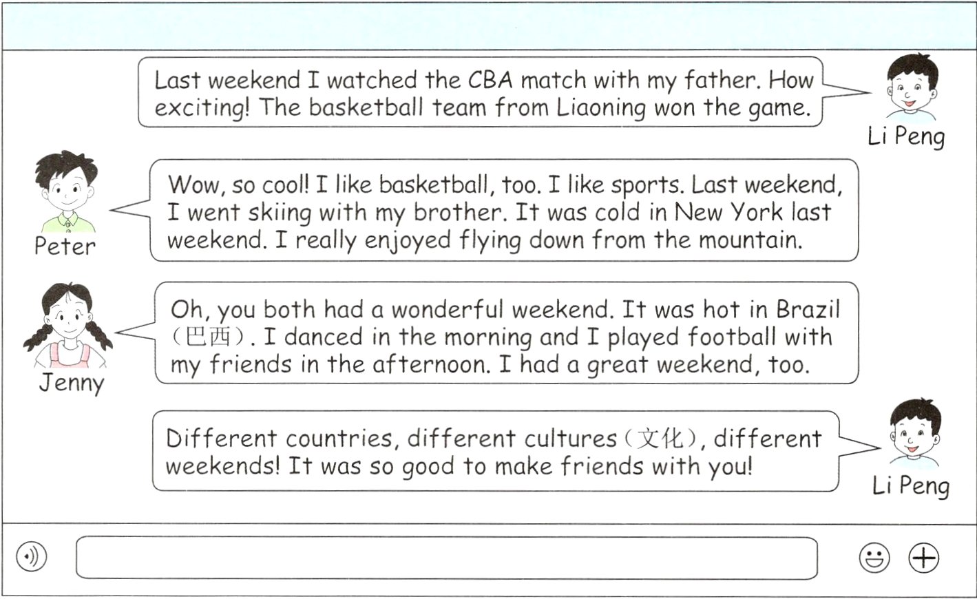 Li Peng,Peter and Jenny are pen pals.They know each other from WeChat.Today they are chatting about their happy weekends.