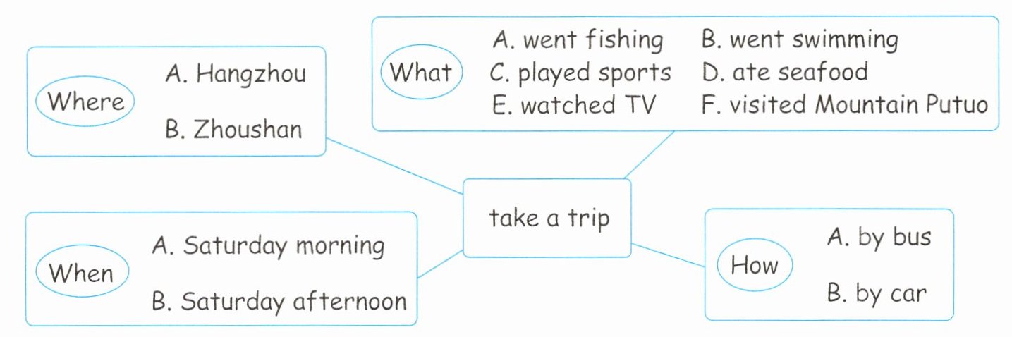 I'm Tom. My parents and I had a 1. ____________ holiday. We went to Beijing by 2. ____________ on the first day of October. On October 4th, we 3. ____________ the Great Wall and the Summer Palace. On October 5th, we went to Beijing Zoo and 4. ____________ many animals. We 5. ____________ pictures and ate good food. We had a good time.