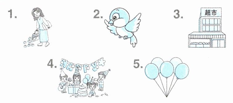 1. falling 2. flying away 3. supermarket 4. birthday 5. balloons