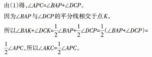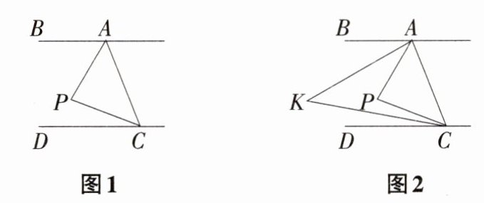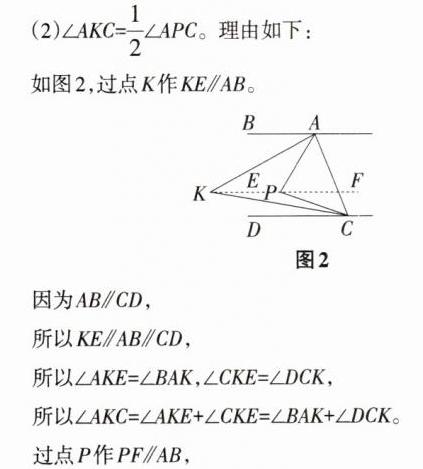 (2)如图2,点P在直线AB,CD之间,∠BAP与∠DCP的平分线相交于点K,写出∠AKC与∠APC之间的数量关系,并说明理由。