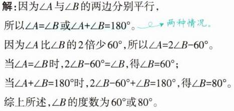 13 (易错题)若∠A与∠B的两边分别平行,且∠A比∠B的2倍少60°,求∠B的度数。
