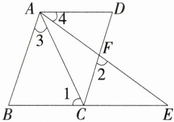 解:因为∠3 = ∠4,所以∠3 + ∠CAE = ∠4 + ∠CAE,即∠BAE = ∠DAC。因为AB//CD,所以∠2 = ∠BAE,所以∠2 = ∠DAC。因为∠1 = ∠2,所以∠1 = ∠DAC,所以AD//BE,所以∠D = ∠DCE。