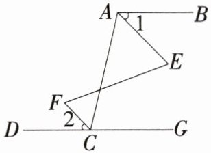 解:因为∠BAC与∠GCA互补,即∠BAC + ∠GCA = 180°(已知),所以AB//CD(同旁内角互补,两直线平行),所以∠BAC = ∠ACD(两直线平行,内错角相等)。又因为∠1 = ∠2(已知),所以∠BAC - ∠1 = ∠ACD - ∠2(等式的性质),即∠EAC = ∠FCA,所以AE//CF(内错角相等,两直线平行),所以∠E = ∠F(两直线平行,内错角相等)。