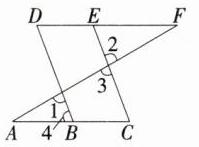 解:如图,因为∠1 = ∠2,∠2 = ∠3,所以∠1 = ∠3,所以BD//CE,所以∠C = ∠4。因为∠C = ∠D,所以∠D = ∠4,所以AC//DF,所以∠F = ∠A = 30°。