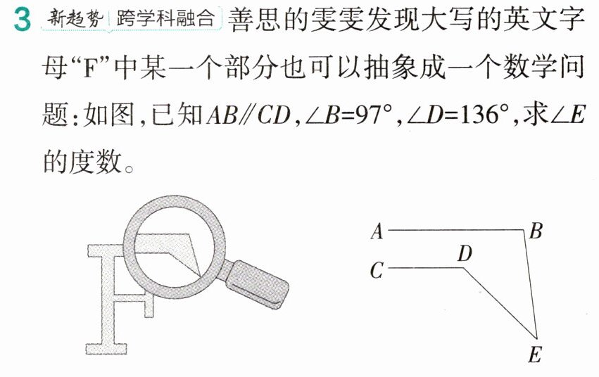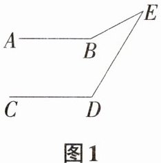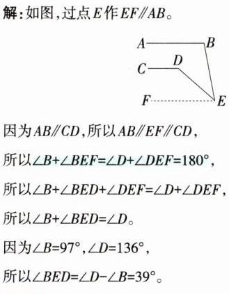 解:∠B = ∠D + ∠E。理由如下: 如下页图1,过点E作EF//AB。 因为AB//CD,所以AB//EF//CD, 所以∠B + ∠FEB = 180°,∠D + ∠FED = 180°, 所以∠B + ∠FEB = ∠D + ∠FED, 即∠B + ∠FEB = ∠D + ∠FEB + ∠BED, 所以∠B = ∠D + ∠BED,即∠B = ∠D + ∠E。